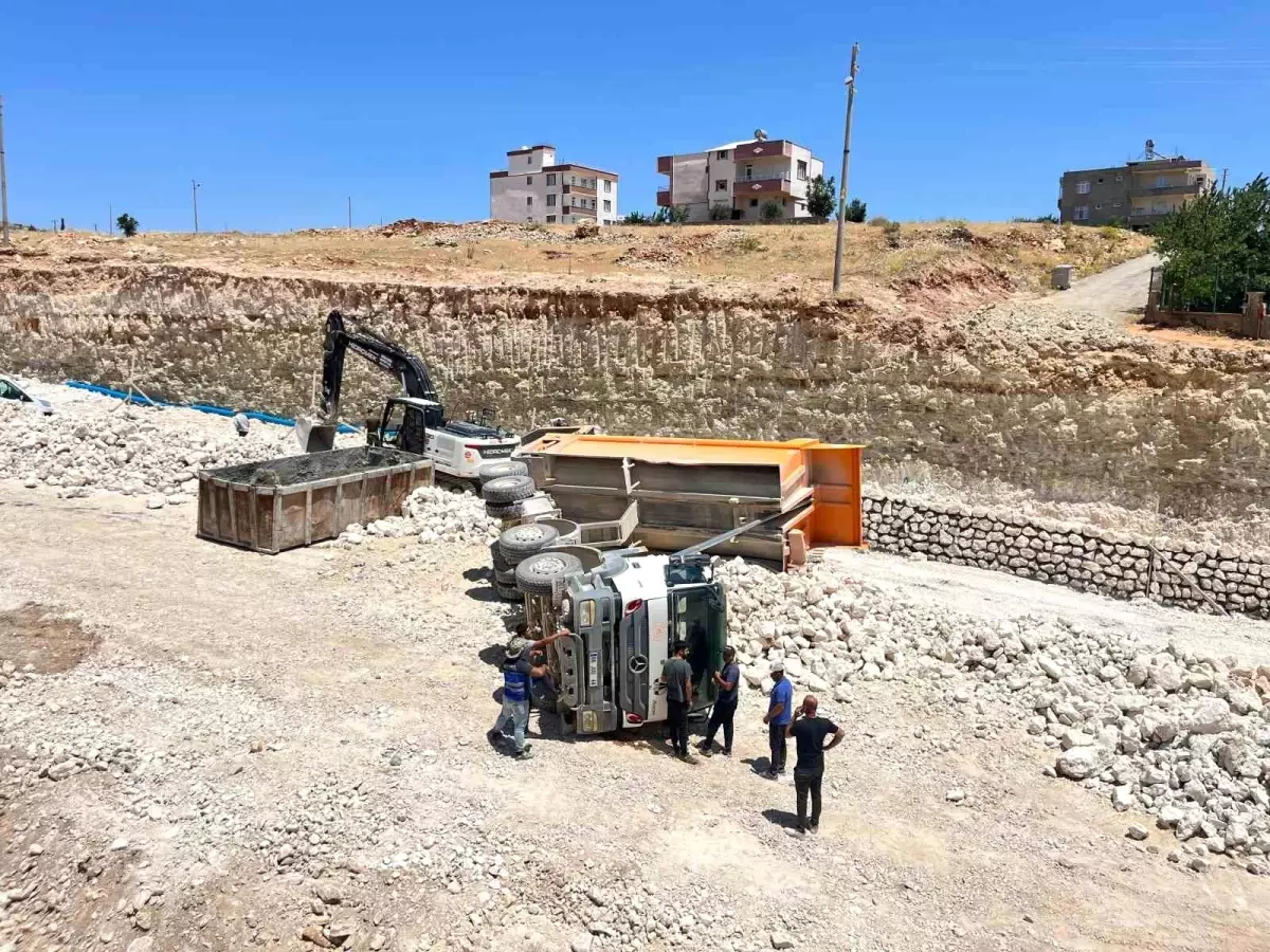 Adıyaman’ın Besni ilçesinde yük boşaltma sırasında denetimden çıkan kamyon devrildi.