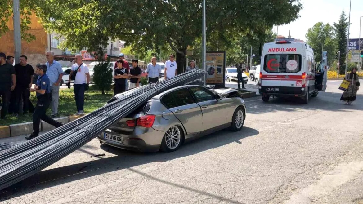 Elazığ’da inşaat demiri yüklü tır, kırmızı ışıkta ani fren yapması sonucu taşıdığı tonlarca demir, kırmızı ışıkta bekleyen lüks arabanın üstüne düştü. Facianın eşiğinden dönülen kazada 2 kişi yaralandı.